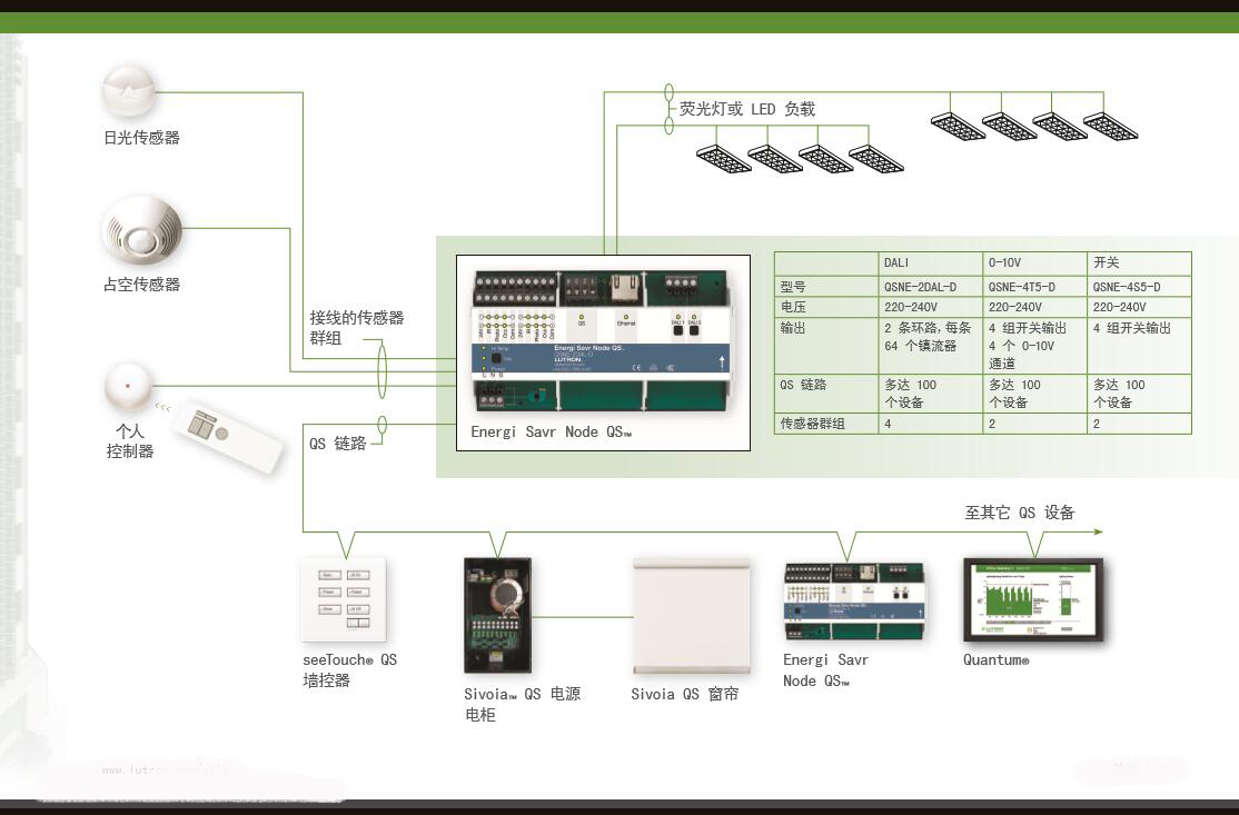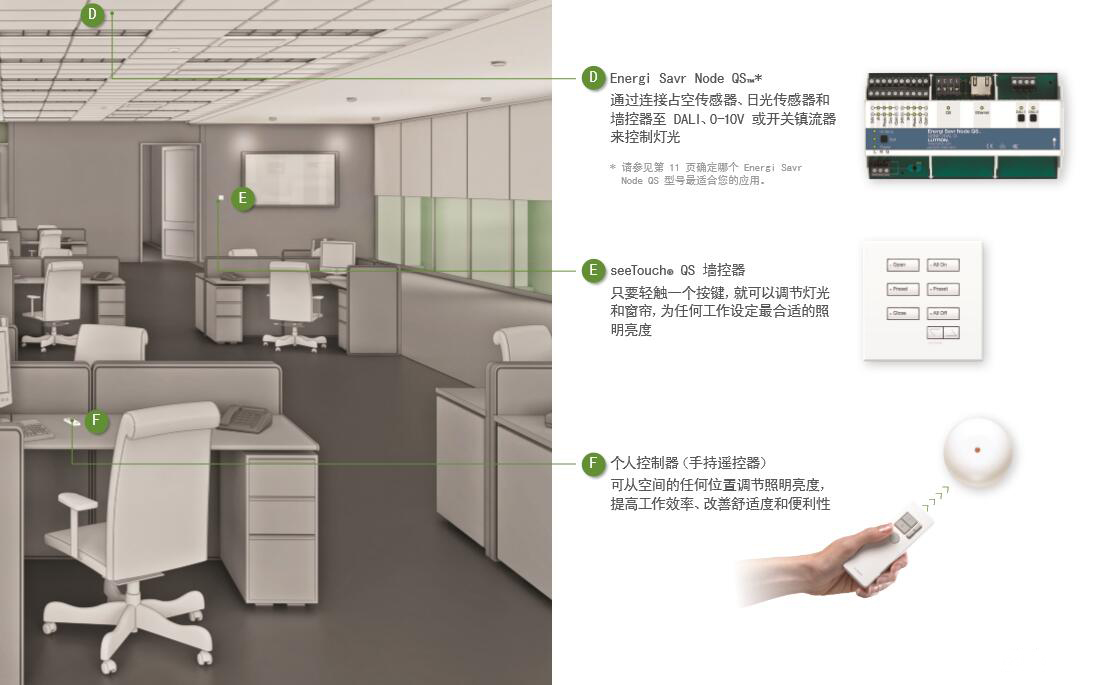 采用一個(gè)模塊就可以控制單個(gè)空間,以致整個(gè)樓層,需要控制多個(gè)樓層時(shí)可添加更多的Energi Savr Node QS模塊。